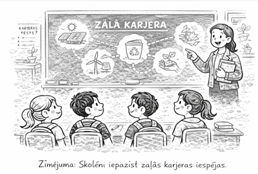 5.a klases skolēni klases stundā iepazinās ar ilgtspējīgām profesijām, piem., zaļās enerģijas inženieris, ekosistēmas speciālists un ūdens enerģētiķis, kā arī piedalījās karjeras testā. Nodarbība rosināja skolēnus domāt par savām interesēm un iespējām nākotnē izvēlēties videi draudzīgu profesiju.