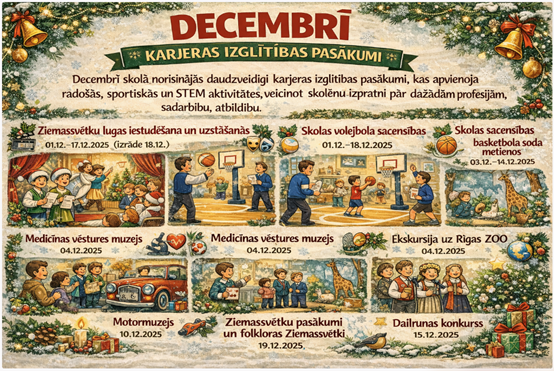 Decembrī skolā norisinājās daudzveidīgi karjeras izglītības pasākumi, kas apvienoja radošās, sportiskās un STEM aktivitātes, veicinot skolēnu izpratni par dažādām profesijām, sadarbību, atbildību.