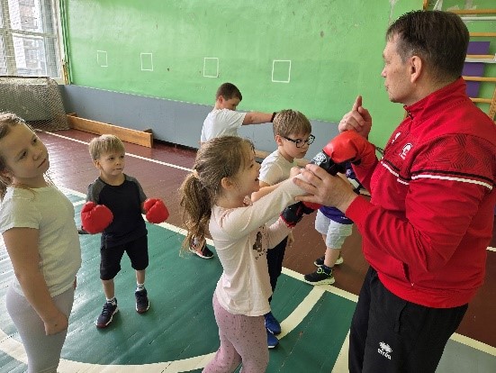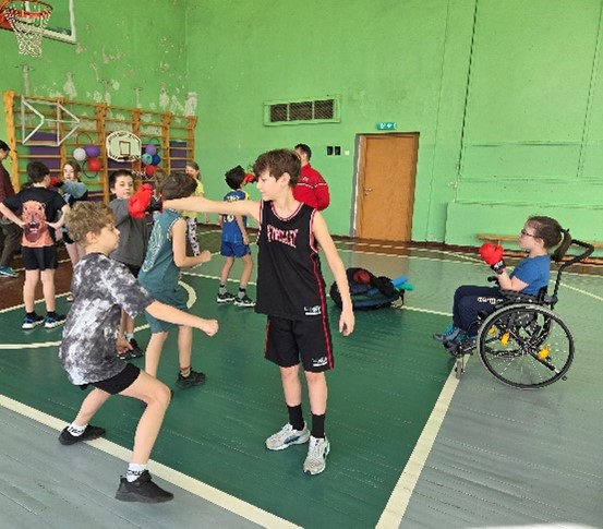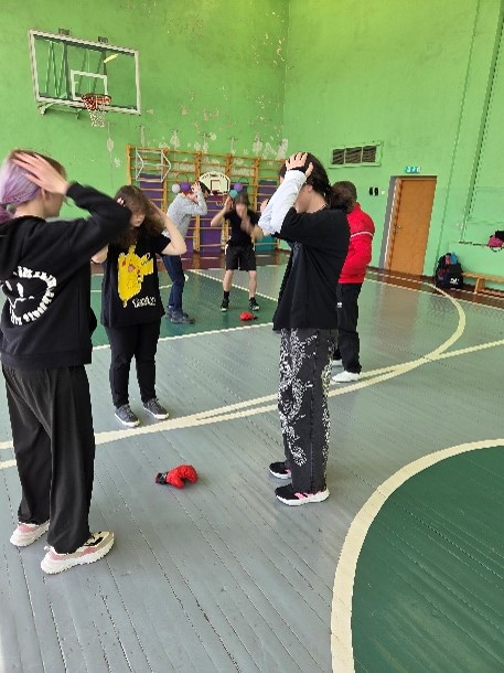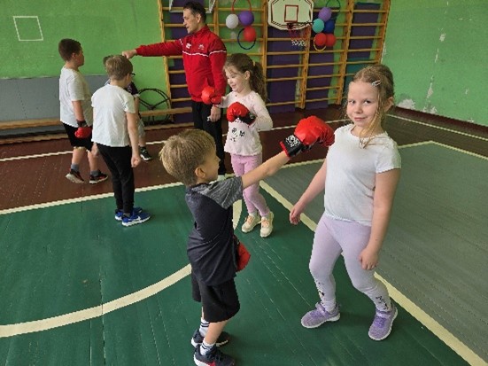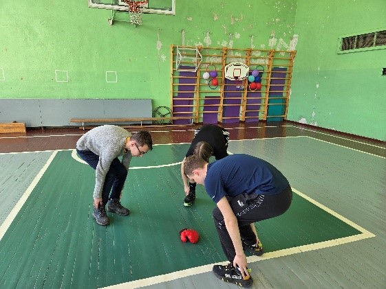 Pēc tam skolēni tika sadalīti pāros, kur viens no viņiem uzvilka boksa cimdus, imitējot sitienu, bet otrs atkarībā no sitiena virziena mācījās izvairīties atkāpjoties, pietupjoties vai noliecoties uz sāniem. Lielu interesi izraisīja iespēja uzvilkt krāsainos boksa cimdus. Trešās klases skolēni, izvairoties no sitiena, papildus apguva kāju darbības. Arī viņiem darbošanās boksa cimdos radīja lielāku interesi par notiekošo.