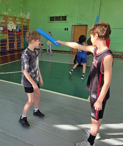 Otra no aktivitātēm, kuras laikā skolēnu emocijas zālē radīja lielu troksni bija izvairīšanās no uzbrucēja ar rīku. Šajā gadījumā, kā uzbrukuma rīks, tika izmantota porolona nūja. Izpildot šo uzdevumu trešās klases skolēni apguva arī atbilstošu kāju darbību.