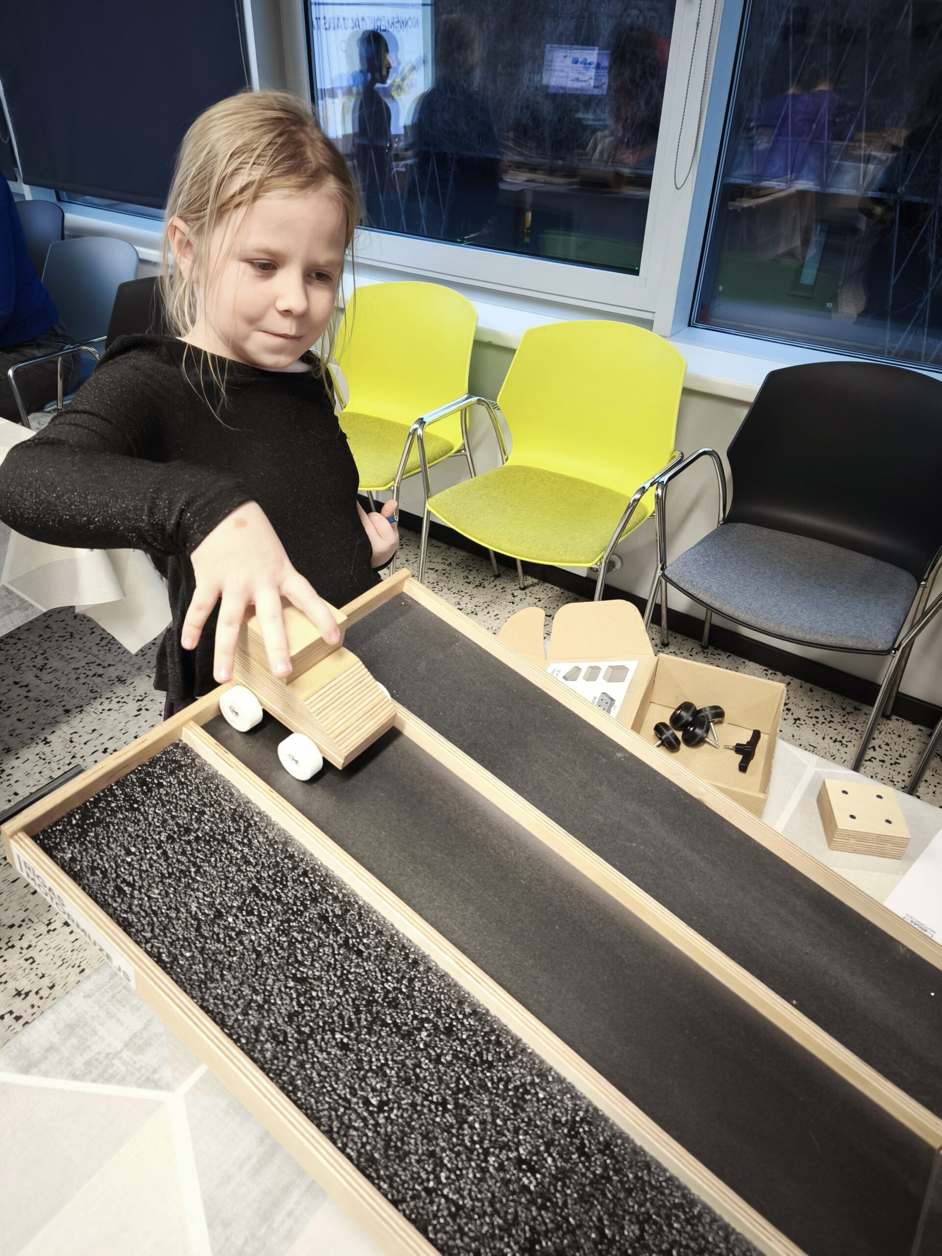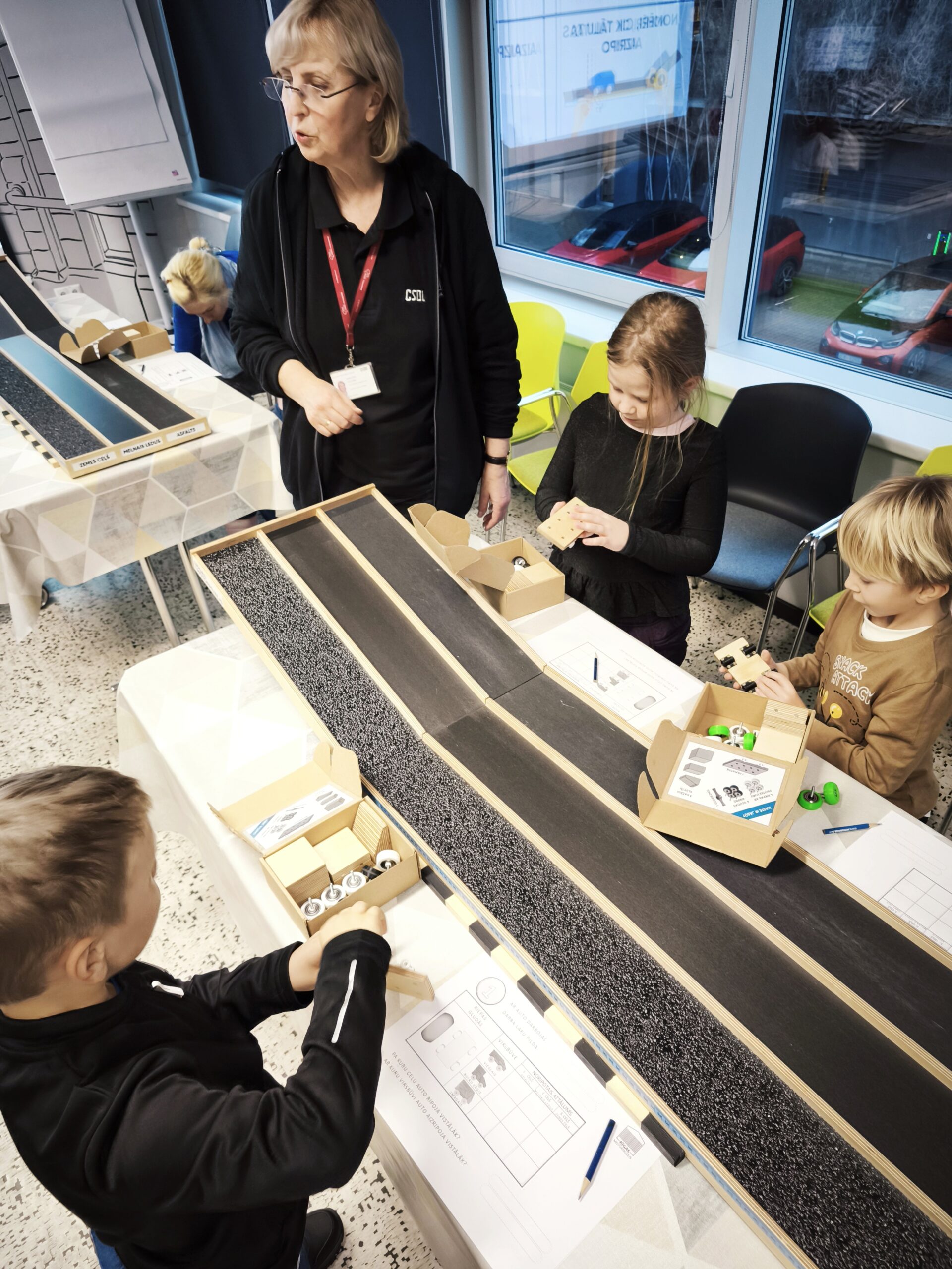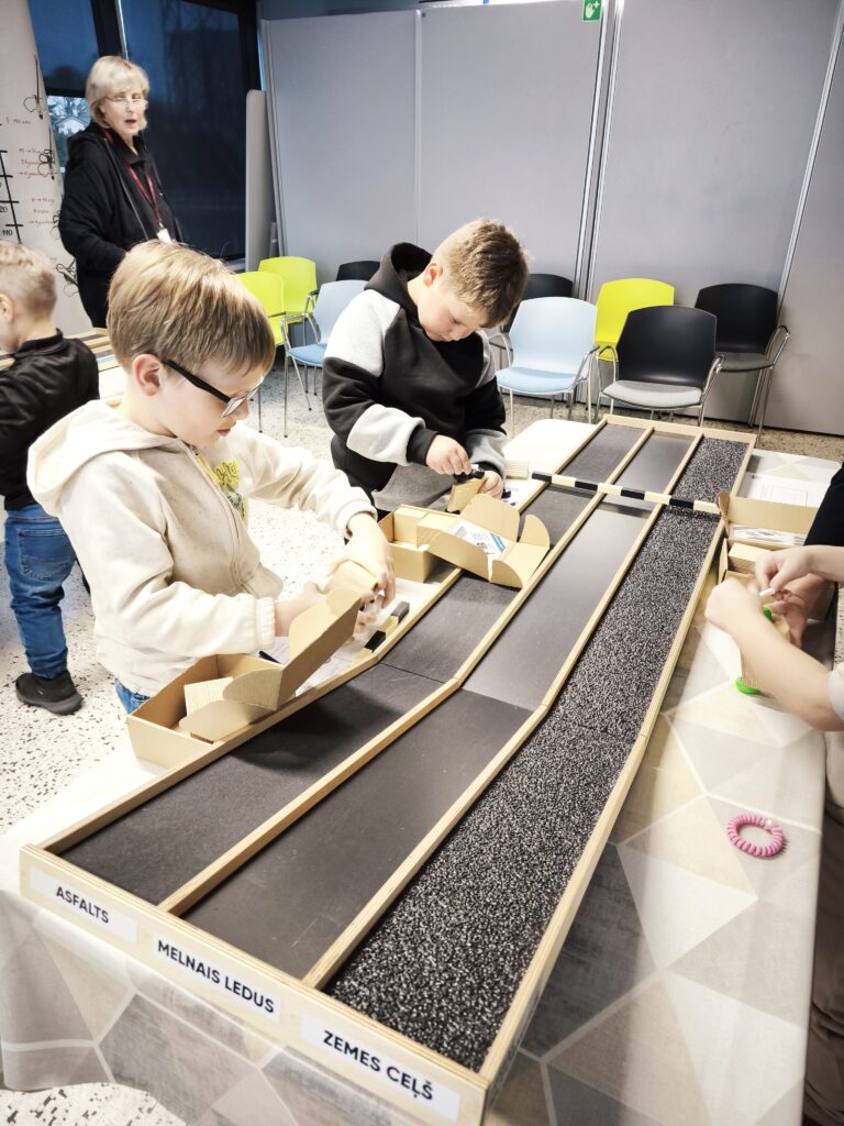 Otrajā daļā sākās praktiskā darbošanās. Telpā bija vairāki galdi, pie katra no tiem vietu ieņēma 3-4 skolēni. Katrs skolēns saņēma savu kastīti ar koka detaļām un 2 veidu riteņu komplektu – gludās un ar protektoriem. Bija jāveido 3 auto modeļi: vieglais, vidēji smagais un smagais auto, kā arī katram no auto veidiem jālieto abi riepu komplekti. Izmantojot novietoto trases modeli ar 3 dažādiem segumiem, veicām eksperimentus. Kurā gadījumā mašīna aizbrauks tālāk. Kurā gadījumā mašīna apstāsies ātrāk? Rezultātus pierakstījām saņemtajās darba lapās.