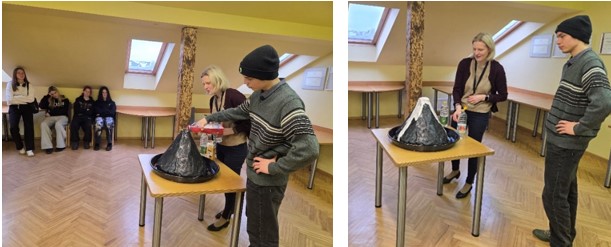 Nodarbības noslēgumā bija iespēja pašiem radīt vulkāna izvirdumu. Vulkāna maketa augšdaļā bija iedobe, kurā noteiktā secībā tika pievienotas vielas, kuras savstarpēji reaģējot radīja vulkāna izvirduma lavas straumes.