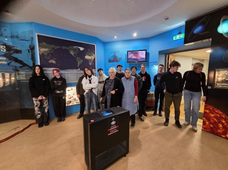 Pie vulkānu modeļiem uzzinājām par to iedalījumu pēc formas un veidu, kā notiek dažādu vulkānu tipu izvirdumi. Iespaidīgākais stāstījums bija par kalderveida vulkāniem, kuru virsotnes sprādziena laikā noārdās un iebrūk konusā. Krātera diametrs var sasniegt pat 26 km. Ar šādu diametru šodien lielākais zināmais kalderveida vulkāns atrodas ASV zem Jeloustounas Nacionālā parka. Tas ir milzīgs pazemes magmas rezervuārs. Šis vulkāns ir izvirdis trīs reizes 2.1 miljonu gadu laikā. Amerikas vulkanologi nākošo izvirdumu gaida starp 21. un 25. gadsimtu, kas ir biedējoši tuvu. Nodarbības turpinājumā devāmies uz sestajā stāvā iekārtoto ekspozīcijas telpu “Dinamiskā ģeoloģija un ieži”. Uzsākām diskusiju, kāda ir vulkānu nozīme cilvēku dzīvē, par vulkānu ietekmi uz saimniecisko darbību, cilvēku drošību un dabas procesiem. Turpinājumā mēs apskatījām un iztaustījām dažādos vulkāniskos izmešus, sākot no ļoti viegliem atdzisušas lavas gabaliņiem līdz pat smagām vulkāniskajām bumbām, kuras pārzāģējot redzami krāsaini minerāli. Pateicoties datorspēlēm, skolēni atpazina krāsaino minerālu – obsidānu. Vulkāniskajos izmešos sastopams arī skaistais violetās nokrāsas ametists.